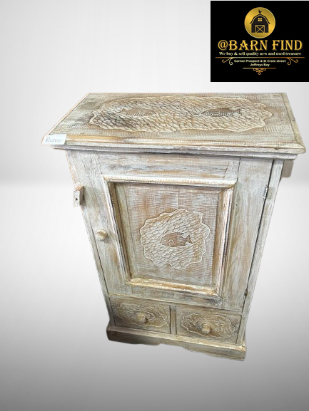 Designed as a side cabinet or nightstand, offering storage with a cupboard space behind the door and two drawers below. Features hand-carved details on the door panel, drawer fronts, and top.