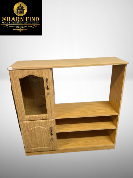 Wooden TV cabinet with a single glass door and multiple open shelves.