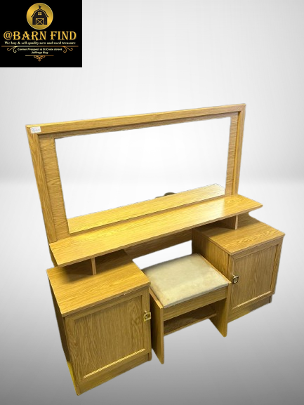Wooden dressing table with a mirror and a stool. It also includes a queen size bed headboard with pedestals.