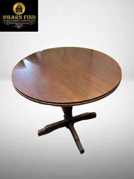 Large round wooden dining table with a pedestal base.
