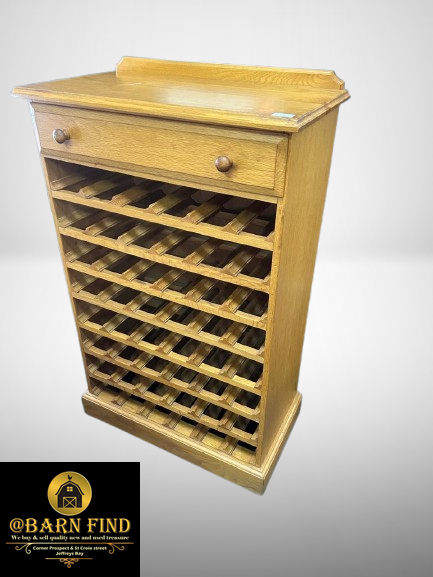 Solid Oregon wood 30-bottle wine rack with a small drawer.
