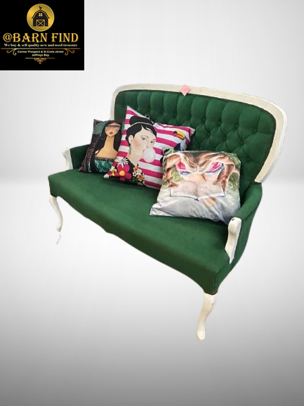 Green tufted 2 seater chair with white-painted, carved wooden legs.
