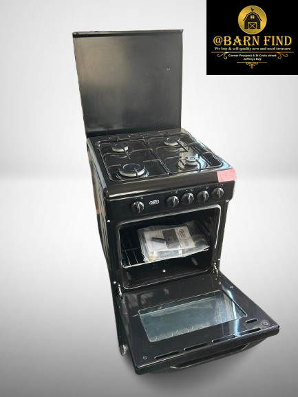 Defy 4-burner Gas Oven and Stove. It features a push-button ignition and a flame failure safety device. An easy-to-clean enamel oven interior with a removable inner glass door.
